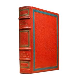 STEINLEN. RICHEPIN (Jean). La chanson des gueux. [Relié à la suite, du même] Dernières chansons de mon premier livre. Paris, E. Pelletan, 1910. Deux ouvrages en un volume in-4, [6] f., 367 p. ; 39 p., ill, maroquin orange, dos à 4 nerfs saillants ornés d'un filet doré, auteur et titre dorés, date frappée en queue, caissons, plats et contreplats bordés d'un encadrement composé d'un listel en maroquin turquoise et de plusieurs filets dorés, double filet doré sur les coupes et coiffes, tranches dorées sur témoins, couvertures et dos conservés [Bernasconi] (transfert des listels sur les bords des gardes). Exemplaire très bien établi par Bernasconi de la réunion de deux ouvrages de Richepin illustrés par Steinlen. - La chanson des gueux : édition intégrale illustrée de 252 com­positions de Steinlen dans le texte gravées par Ducourtioux dont des bandeaux, vignettes à mi-page et culs-de-lamps. Tiré à 351 exemplaires : un des 267 sur vélin du Marais (n° 149). - Dernières chansons de mon premier livre : édition originale illustrée de 24 compositions de Steinlen. Tiré à 328 exemplaires : un des 240 sur vélin du Marais (n° 149). PROVENANCE «A.S.» (ex-libris gravé avec deux putti).