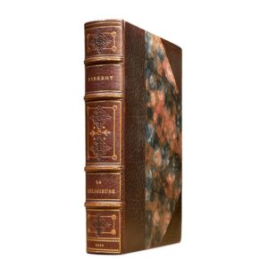 VAN MAELE. DIDEROT (Denis). La religieuse. Paris, J. Chevrel, 1916. In-8, [3] f. dont 1 bl., IX-311 p., [4] f. dont 2 bl., demi-maroquin havane à coins, dos à quatre nerfs saillants ornés d'une roulette dorée, auteur et titre dorés, date frappée en queue, caissons ornés de 4 fers à froid, de f leurons dorés et bordés d'un filet doré avec petits cercles mosaïqués aux angles, tête dorée, non rogné, couverture et dos conservés (dos passé). Édition illustrée d'un frontispice, 9 planches et un cul-de-lampe gravés à l'eau-forte par Martin van Maele. La préface est ornée d'une vignette en-tête et d'un cul-de-lampe gravés sur bois par Eugène Dété. Tirage limité à 250 exemplaires : un des 30 sur japon (n° 24), conte­nant toutes les eaux-fortes en deux états, dont l'eau-forte pure.