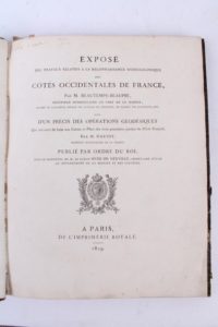 BEAUTEMPS-BEAUPRE (Charles-François) [1766-1854] EXPOSE DES TRAVAUX RELATIFS A LA RECONNAISSANCE HYDROGRAPHIQUE DES CÔTES OCCIDENTALES DE FRANCE (suivi d’) UN PRECIS DES OPERATIONS GEODESIQUES qui ont servi de base aux cartes et plans des trois premières parties du Pilote Français, par M. Daussy. 1 vol. in-4 de 124 pages relié. Paris Imprimerie Royale 1829 (Edition Originale). Ouvrage accompagné d’1 grande carte trigonométrique gravée, dépliante des Côtes Occidentales Françaises, dressée par M. Michel. Mors fendus, mq de cuir au dos. Bon état intérieur. Réf : Polak n° 528