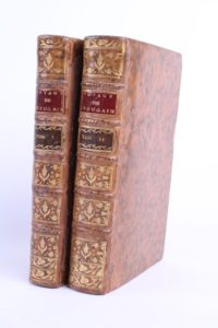 ANONYME [BOUGAINVILLE] VOYAGE AUTOUR DU MONDE PAR LA FREGATE DU ROI LA BOUDEUSE ET LA FLUTE L’ETOILE en 1766-1767-1768 et 1769. 2 vol. gd in-12 reliés plein veau marbré époque, dos à nerfs à caissons fleuris, pièces de titre bordeaux et tomaisons vertes, tranches rouges. Paris Saillant & Nyon 1772 (2è éd. augmentée). Avec 21 cartes et plans dépliants + 3 gravures dépliantes. Epidermures sur les plats, coins en pied frottés, sinon beaux ex. à l’intérieur très frais. Réf : Barbier IV - pp. 1061e - Chadenat I - n° 5904 - Boucher de La Richarderie I - pp. 126 - Sabin II - n° 6865 « Contient un vocabulaire de l’île de Tahiti et une brève explication des termes marins utilisés dans l’ouvrage »