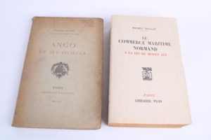 GUENIN (Eugène) ANGO ET SES PILOTES d’après des documents inédits tirés des archives de France, de Portugal et d’Espagne. 1 vol. gd in-8 broché. Paris Imprimerie Nationale 1901. Bon ex. Il est joint : MOLLAT (Michel) LE COMMERCE MARITIME NORMAND A LA FIN DU MOYEN-ÂGE. 1 fort vol. in-8 broché. Paris Plon 1952 (Edition Originale). Bel ex. Non coupé. Soit 2 vol.