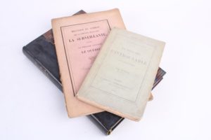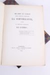 ANONYME [LOSTANGES (Chev. De)] RELATION DU COMBAT DE LA FREGATE FRANÇAISE « LA SURVEILLANTE » CONTRE LA FREGATE ANGLAISE « LE QUEBEC ». 1 plaqu. in-8 brochée de 60 pp. et 1 planche hors-texte. Lorient Corfmat 1858. Rare. Le chevalier de Lostanges était officier sur « la Surveillante ». Petite perte de papier au dos de la couverture (insolée). Réf : Barbier IV - pp. 224e Polak n° 6123 « Détails importants sur une des plus célèbres batailles navales qui eut lieu pendant la guerre d’Indépendance américaine entre les Français et les Anglais le 6 octobre 1779 » Roche Bâtiments flotte de guerre I - pp. 427 « Surveillante, frégate de 32 canons. Combat à l’abordage HMS Québec à Ouessant, l’anglais incendié explose et les 2 navires se séparent … » Il est joint : CASTEX (Lt de vaisseau) LA MANŒUVRE DE LA PRAYA (16 avril 1781). 1 vol. gd in-8 relié 1/2 chagrin bleu, dos lisse, tête dorée, couverture conservée. Paris Fournier 1913. Bel ex. Bataille navale pendant la guerre d’indépendance américaine entre la flotte britannique commandée par George Johnstone et la flotte française commandée par le Bailli de Suffren, dans la baie de la Praya à l’île de San Iago au Cap-Vert. Victoire stratégique de Suffren. Réf : Polak n° 1512 « Etude politique, stratégique et tactique (d’après de nombreux documents inédits) Soit 2 vol.