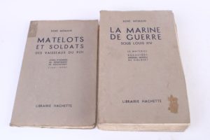 MEMAIN (René) LA MARINE DE GUERRE SOUS LOUIS XIV. 1 fort vol. gd in-8 broché. Paris Hachette 1937. Il est joint : du même MATELOTS ET SOLDATS DES VAISSEAUX DU ROI. 1 vol. gd in-8 broché. Paris Hachette 1937. Soit 2 vol. Rare.