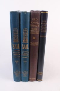 ROBINSON (Charles) OLD NAVAL PRINTS THEIR ARTISTS AND ENGRAVERS. 1 vol. gd in-4 relié pleine toile bleue éditeur à la bradel. Londres Holme 1924. Avec 96 planches hors-texte. Bel ex. Il est joint : KOESTER (August) SHIP MODELS OF THE SEVENTEENTH YO THE NINETEENTH CENTURIES with 124 plates. 1 vol. gd in-4 reliure éditeur à la bradel. New-York Weyhe 1926. Très bel ex. Il est joint : LUBBOCK (BASIL) SAIL - THE ROMANCE OF THE CLIPPER SHIPS. 2 vol. gd in-4 reliés pleine toile bleue éditeur, têtes bleues. Londres Blue Peter 1930. Nombreuses illustrations en couleurs hors-texte. Très beaux ex. Soit 4 vol.