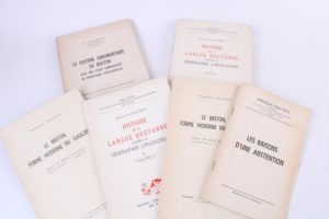 FALC’HUN (François) HISTOIRE DE LA LANGUE BRETONNE d’après la géographie linguistique. 2 vol. gd in-8 brochés. Paris PUF 1963. Il est joint : du même LES RAISONS D’UNE ABSTENTION. 1 plaqu. in-8 brochée hors-commerce. Il est joint : du même LE SYSTEME CONSONANTIQUE DU BRETON avec une étude comparative de phonétique expérimentale. 1 vol. gd in-8 broché. Rennes Plihon 1951. Il est joint : du même LE BRETON FORME MODELE DU GAULOIS. 1 plaqu. gd in-8 brochée. Rennes Plihon s.d. (2 EXEMPLAIRES). Soit 6 vol.