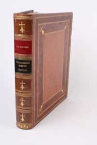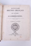 LE GONIDEC (J.F.M.M.A.) DICTIONNAIRE BRETON FRANÇAIS précédé de sa grammaire bretonne et enrichi d’un avant-propos d’additions et des mots gallois et gaëls correspondant au Breton par Hersart de La Villemarqué. 1 vol. in-4 relié pleine basane, dos à nerfs orné de fleurs de lys, pièce de titre rouge et verte, 1er plat à multiples filets d’encadrement dorés et bordures estampées à froid. St Brieuc Prud’homme 1850. Rousseurs éparses, sinon très bel ex.