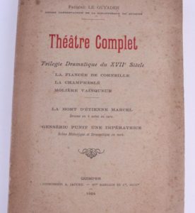 LE GUYADER (Frédéric) THEÂTRE COMPLET - Trilogie dramatique du XVIIè siècle (La fiancée de Corneille - La Champmeslé - Molière vainqueur - La mort d’Etienne Marcel). 1 vol. gd in-8 broché. Quimper Barguin 1924. Non coupé. E.A.S. de l’auteur à Mr Le Goaziou. Premier plat sali.