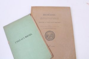 PEQUART (Marthe & St Just) HOËDIC - 2ème station - nécropole du mésolithique côtier armoricain. 1 vol. gd in-4 broché. Anvers De Sikkel 1954. Nombreuses illustrations photographiques, avec 42 figures et in-fine 10 planches hors-texte. Très bel ex. rare. Il est joint : MAURICET (Dr J.-J.) L’ISLE-AUX-MOINES - ses mœurs et ses habitants - ses monuments mégalithiques. 1 plaqu. gd in-8 en couverture d’attente. Vannes Galles 1878. Illustré de 2 planches dont 1 dépliante d’un cromlech et de dolmens. Bel ex. Soit 2 vol.