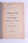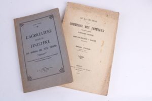 PICAUD (Ernest) DE LA CULTURE ET DU COMMERCE DES PRIMEURS DANS LES COMMUNES DE PLOUGASTEL-DAOULAS ET DE ST POL-DE-LEON-ROSCOFF. 1 vol. gd in-8 broché. Rennes Journal de Rennes 1912. Non coupé. Peu courant. Couverture salie. Intérieur très frais. Il est joint : OGES (Louis) L’Agriculture dans le Finistère au milieu du XIXè siècle. 1 vol. in-8 broché. Quimper Le Goaziou 1949. E.A.S. de l’auteur. Dos insolé, sinon bel ex. Soit 2 vol.