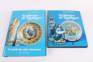 TABURET (Marjatta) LA FAÏENCE DE QUIMPER. 1 vol. in-4 relié pleine toile bleue sous jaquette couleurs. Paris Sous le vent 1979 (Edition Originale). E.A.S. de l’auteur daté 19 décembre 1979. Très bel ex. Il est joint : de la même LA FAÏENCE DE QUIMPER - Le guide du collectionneur. 1 vol. gd in-4 relié pleine toile bleue sous jaquette couleurs. Paris Sous le vent 1990 (revue & augmentée de la première édition). E.A.S. de l’auteur et du photographe. Très bel ex. Documentation et articles de journaux. Soit 2 vol. Avec de nombreuses photos n. & coul. in & ht.