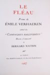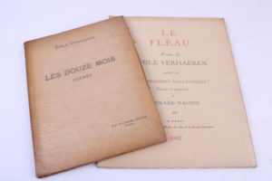 [LE MEILLEUR] VERHAEREN (Emile) Les douze mois (poèmes). Avec 53 bois originaux gravés par Georges Le Meilleur. 1 vol. in-folio broché, couverture rempliée. Paris D’Alignan 1921. Tiré à 280 ex. numérotés, celui-ci 1 des 250 sur Arches (n° 182). Non coupé. Couverture jaunie, sinon bel ex. Réf : Monod II – n° 11030 - Carteret V – pp. 194 Il est joint : [NAUDIN] VERHAEREN (Emile) Le Fléau. Dessins et manuscrit de Bernard Naudin. 1 vol. gd in-folio en ff. cartonné sous jaquette imprimée et rempliée. Paris Kae-lin 1927. Tiré à 302 ex. numérotés, celui-ci 1 des 250 sur Hollande (n° 105). Tête de la couverture légèrement insolée, sinon bel ex. Réf : Monod II – n° 11036 - Carteret IV – pp. 390 Soit 2 vol.
