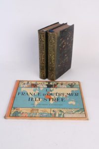 GUERIN (Léon) Histoire maritime de France. Avec 31 illustrations par Gudin, Isabey, Johannot, Marckl, Raffet. 2 vol. gd in-8 reliés 1/2 basane verte, dos lisses à ornementation romantique. Paris Ledoux 1843. Dos insolés, rousseurs Il est joint : FAUCHERE (A.) & GALLAND (A.) La France d’Outre-Mer illustrée. 1 vol. in-4 oblong dans un cartonnage illustré en couleurs, dos toilé. Paris Blondel La Rougery 1931. Nombreuses illustrations couleurs dont une carte pour chaque pays colonial. Couverture désolidarisée. Bon état intérieur Soit 3 vol.