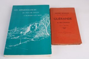HUET (Victor) Les appartenances du pays de Dinan à travers les âges. 1 vol. gd in-4 broché, couverture illustrée. Blois Rollin 1976. Tiré à 360 ex. numérotés, celui-ci n° 255. Illustrations. Il est joint : GREGOIRE (Abbé P.) Histoire religieuse de la ville et du pays de Guérande sous la Révolution. 1 vol. gd in-8 broché. Nantes Dupas 1923 [1922]. Bon ex. Soit 2 vol.