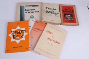 RIOU (Jakez) - An ti Satanazet. Illustrations Skeudennou P. Péron - Skridou Breizh 1944 (Edition Originale). - L’herbe de la vierge - Aux Portes du large 1947 (Edition Originale). - Gorsedd Digor - Emgleo Breiz 1973. Illustrations. - An ti Satanazet Gand motenaou 1976. - Lizer an hini maro 1925 (Edition Originale). - Gestenn ar Werc’hez - Skrid ha Skruden 1934 (Edition Originale). 6 vol. brochés. Provenance : Succession Jakez Riou
