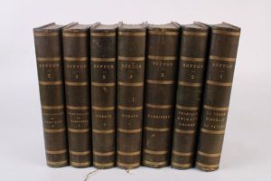BUFFON Œuvres complètes (dont 2 compléments de LESSON). Suivies de la classification comparée de Cuvier, Lesson, etc … 7 vol. gd in-8 reliés 1/2 basane verte, dos lisse à filets dorés. Paris Pourrat 1837-1838. Avec 10 planches en noir, 4 cartes en noir & 282 planches en couleurs. Brunissures par endroits, sinon bel ensemble.