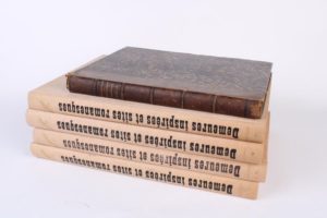 LECUYER (Raymond) / CADILLAC (Paul-Emile) DEMEURES INSPIREES ET SITES ROMANESQUES. 4 vol. gd in-folio reliés pleine toile grise à la bradel, premiers plats imprimés. Paris L’Illustration [Baschet] circa 1955-1958. Très nombreuses illustrations n. & coul. in & ht. Pieds des reliures insolés. Intérieur très frais. Il est joint : [BOURGOGNE]. CHAILLOU DES BARRES (Baron) LES CHÂTEAUX D’ANCY-LE-FRANC, DE SAINT-FARGEAU, DE CHASTELLUX ET DE TANLAY. 1 vol. gd in-4 relié 1/2 basane, dos à nerfs. Paris Vaton 1845 (Edition Originale). Coiffes élimées, coins & bords frottés, rousseurs. Soit 5 volumes