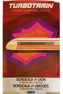 SNCF — Affiche de promotion des lignes " Bordeaux-Lyon Bordeaux-Limoges en turbotrain, grand confort, 1ère et 2e cl. ", d'après Eric. — Yves Alexandre Conseil - Studio Eric. SNCF 1974, n° 81.
