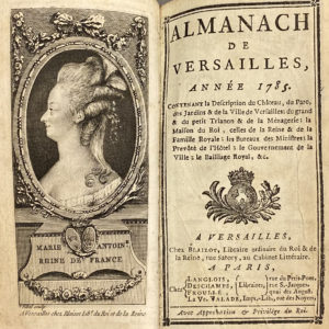 ALMANACH de Versailles, année 1785. — Versailles, Blaizot ; Paris, Langlois, Deschamps, Froullé, Veuve Valade, [1785]. — Petit in-12, maroquin vert, triple filet doré, dos orné, pièce de titre rouge, tranches dorées (Reliure de l'époque).