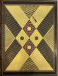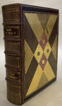quatre filets dorés se croisant dans les angles, doublure de satin illustrée, gardes de soie verte à motifs de treillages, tête dorée, non rogné, couverture et dos, étui (René Kieffer).