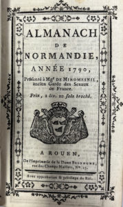 ALMANACH de Normandie. — Rouen, Dame Besongne, 1790. — In-12, maroquin rouge, bordure dorée, trophée au centre des plats avec gerbe de blé, faucille, fléau, dos orné, tranches lisses (Reliure de l’époque).