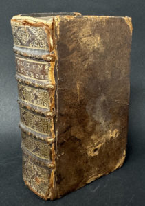 Reliure pleine peau brune, dos à nerfs et caissons frappés or de rinceaux.