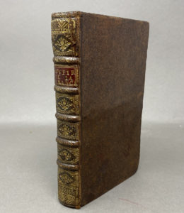 Basane brune, dos à nerfs et caissons dorés, pièce de titre rouge
