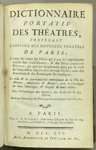LERIS (Antoine de)]. — DICTIONNAIRE PORTATIF DES THEATRES, contenant l’origine des différens théatres de Paris ; le nom de toutes les Pieces qui y ont été représentées depuis leur établissement, & des Pièces jouées en Province [..] Le...
