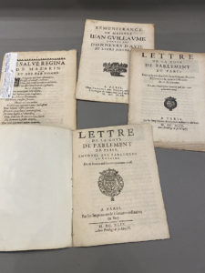 Lettre de la cour de parlement du royaume, Paris, Les imprimeurs et libraires ordinaires du Roy, 1649, Feuillet en 4 pages reliées.