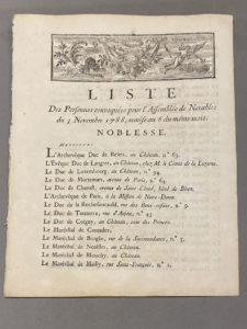 LISTE DES PERSONNES CONVOQUÉES pour l'Assemblée de Notables du 3 novembre 1788, remise au 6 du même mois, Paris, imprimerie Royale, feuillet en 4 pages.
