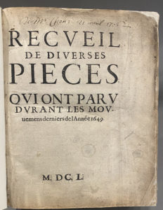 MAZARINADES, Recueil de diverses pièces qui ont paru durant les mouvements des années 1649 et 1650. — Page de titre en facsimilé, In-4.