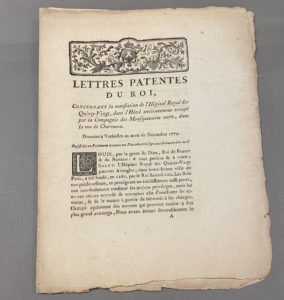 PARIS, HOPITAL DES QUINZE-VINGT, Lettres patentes du Roi concernant la translation de l'Hôpital Royal des Quinze-vingt dans l'Hôtel ancienement occupé par les compagnie des Mousquetaires noirs, dans la rue de Charenton 1779, feuillets en 4 pages.