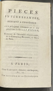 PIÈCES INTÉRESSANTES, servant à constater les pincipaux évènements qui se sont passés sous la Mairie de J. Petion, Chez Garney, Paris, An deux, 1793-1794. — In-8