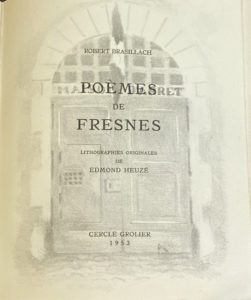 BRASILLACH Robert, illustrations de HEUZE Edmond Poèmes de Fresnes, 1 vol., en feuilles sous chemise, illustré de lithographies de Heuzé. Editions Cercle Grolier, 1953. — Tirage limité à 200 exemplaires, celui-ci porte le n°37.