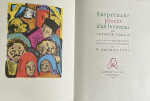 CARCO Francis, illustrations d' AMBROGIANI Pierre Surprenant procès d'un bourreau, 1 vol., en feuilles sous chemise, illustré par Ambrogiani. — Editions Georges Roche, Marseille, 1948.