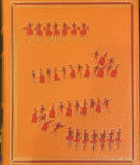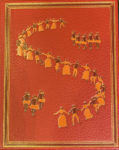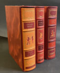 Reliures d'éditeur orange, rouges et grenat, les plats décorés d'une ronde de personnages en couleur rehaussés d'un filet doré. Auteur, titre, artiste et personnages sur les dos. Emboîtages en papier marbré, la cuve bordée de cuir.