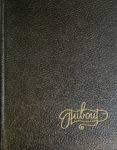 Reliure plein cuir noir, titre et dessin frappés à chaud sur le dos, premier plat orné du nom de l'illustrateur.