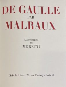 [DE GAULLE] MALRAUX André, illustrations de MORETTI Raymond. — De Gaulle par Malraux, 1 vol., reliure d'éditeur, illustré 28 dessins de Moretti. — Editions le Club du Livre, Paris, 1980.