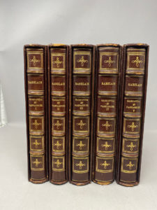 RABELAIS (François). — Gargantua et Pantagruel. — Paris, Le Vasseur & Cie, 1936. ill. par Icart, chagrin bordeaux, triple filet doré, arabesques aux angles et au milieu de chaque côté, grand motif à décor d'arabesques au centre, dos à nerf...