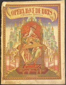Couverture d'après un dessin de Bilibine. Préface retraçant l'historique de l'Opéra Privé de Paris créé par Maria Kousnezoff-Massenet et son mari Alfred Massenet, un portrait de Maria Kousnezoff-Massenet contrecollé, en couleurs, reproductions deux maquettes de décor et six dessins costumes en couleurs de Korovine contrecollées. Ed° Publicité commerciale et Théâtrale, 46, rue de Provence, Paris.