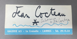 COCTEAU Jean - Carton d'invitation de la Galerie 65 à Cannes " les innamorati " 1961.