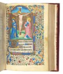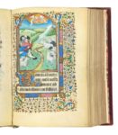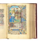[LIVRE D’HEURES / PARIS]. Heures manuscrites de la fin du XVe siècle en un volume in-8° ancien (140 x 197 mm), velours rouge, dos à nerfs, tranches dorées (reliure fin XIXe s.). CARACTÉRISTIQUES 195 ff. de vélin (dont un blanc, le 105). Exemplaire réglé portant quatorze lignes à la page. Texte en latin (sauf pour le calendrier et les neuf derniers feuillets en français), calligraphié en lettres gothiques (littera textualis), à l’encre noire et rubriqué. ATELIER & ORIGINE Livre executé dans un atelier parisien. COMPOSITION • ff. 1-12 v° : calendrier des saints ; • ff. 13-18 v° : commencement de l’Évangile selon st Jean & suite des Évangiles selon st Luc, st Mathieu & st Marc ; • ff. 18 v° - 26 v° : commencement de l’office de la Sainte Vierge ; • ff. 27-54 : suite de l’office de la Sainte Vierge (avec psaumes, lectures & chants) ; • ff. 55-67 v° : Laudes, suite de l’office de la Sainte Vierge (avec psaumes & prières) ; • ff. 68-74 v° : suite de l’office de la Sainte Vierge (avec psaumes & prières) ; • ff. 75-79 v° : suite de l’office (avec psaumes & prières) ; • ff. 80-84 v° : sextes (avec psaumes & prières) ; • ff. 85-89 v° : suite de l’office de la Sainte Vierge ; • ff. 90-97 v° : suite de l’office (avec psaumes) ; • ff. 98-104 : suite de l’office (avec psaumes) ; • ff. 106-119 v° : suite de l’office (avec psaumes) ; • ff. 119 v° - 125 : litanies des saints ; • ff. 126-127 : suite de l’office de la Sainte Vierge (avec hymnes) ; • ff. 127-128 : primes ; • ff. 128-130 : tierces ; • ff. 130 v° - 135 : suite de l’office de la Sainte Vierge (avec hymnes) ; • ff. 136-186 : office des morts (avec psaumes & lectures) ; • ff. 187-195 v° : prières à la Sainte Vierge (en français). ILLUSTRATIONS Quatorze grandes miniatures (65 x 100 mm) : • f. 13 : st Jean l’Évangéliste ; • f. 27 : l’Annonciation ; • f. 55 : la Visitation ; • f. 68 : la Nativité ; • f. 75 : l’annonce aux bergers ; • f. 80 : l’adoration des mages ; • f. 85 : la présentation au Temple ; ORNEMENTATION • Très riche décor floral et fruitier en bande latérale extérieure, différent sur chaque page, depuis le premier feuillet du calendrier jusqu’au dernier du texte et décor du même genre entourant les grandes miniatures sur trois côtés ; • très nombreuses lettrines, de différentes tailles, peintes sur fond bleu ou rouge et rehaussées d’or et très nombreux bouts-de-ligne ; • hampes prolongeant toutes les grandes lettrines qui accompagnent les pages portant des miniatures ainsi que deux autres grandes lettrines (aux ff. 18 v° & 22 v°). DÉFAUTS Ex-libris manuscrit du milieu du XVIIe s. en page de garde. Toutes petites taches d’encre en marge de pied des feuillets 50 & 51 et quelques infimes marques de rousseurs. • f. 90 : la fuite en Égypte ; • f. 98 : le couronnement de la Sainte Vierge ; • f. 106 : le roi David ; • f. 126 : le Christ en croix, la Sainte Vierge et st Jean ; • f. 130 v° : la Pentecôte ; • f. 136 : l’office des morts ; • f. 187 : le Christ sur les genoux de la Sainte Vierge, ste Anne et accompagnée d’une autre Sainte.