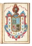 [MANUSCRIT]. [ESPAGNE] et [PÉROU] Cartas ejecutorias en faveur de la famille Saenz de Tejada relatives aux terres en Espagne sises à Nieva de Cameros (La Rioja) [suivi de] Document généalogique et héraldique pour la famille Saenz de Tejada, signé du héraut d'armes Romon Zazo y Ortega. En espagnol, manuscrit décoré sur papier et enluminé sur parchemin Espagne, Valladolid, 30 novembre 1771 et rajouts datés de 1772. 75 ff. de papier + 6 ff. non chiffrés de papier + 13 ff. non chiffrés de parchemin, manuscrit composite sur papier et sur parchemin, écriture italique à l'encre brune, texte copié sur parchemin inscrit dans des encadrements de filets tracés à l'encre rouge, initiales et bandeaux calligraphiées et ornées, deux grandes compositions enluminées sur parchemin, trois initiales décorées enluminées, bandeau-cartouche enluminé dans lequel est inscrit le nom « Saenz Tejada ». Reliure de veau brun marbré, dos à 5 nerfs cloisonné et fleuronné, roulette dorée sur les coupes, tranches rouges, papier marbré peigné (épidermures et taches, coins émoussés). Dimensions : 310 x 210 mm ; dimensions des feuillets : 300 x 200 mm. Une note indique au fol. 1 : « Este libro que contiene documentos relativos a la familia Saenz de Fejada pertenecen a Flora Saenz de Tejada de Cazotte pour haberlos herdado de su padre Don Manuel Saenz de Tejada. [signé] Flora de Cazotte ». Ces Cartas ejecutorias furent accordées par le roi Charles III, roi d'Espagne et des Indes orientales et occidentales (1716-1788) à Diego Saenz de Tejada, de la Ciudad de los Reyes del Peru en la Nueva España [Lima, Pérou] : « […] por Francisco Martinez Guzman en nombre de Don Diego Saenz de Thejada vecino de la Ciudad de los Reyes del Peru, en los nuestros reynos de Yndias… ». Elles concernent les droits de la famille sur la petite ville de Nieva de Cameros (Espagne, province de La Rioja). La famille Saenz de Tejada et Sanchez de Tejada s'est illustrée dans les Indes, notamment à Puerto Rico (Diego de Sáenz de Carasa y Sánchez de Tejada est gouverneur à Puerto Rico au XVIe siècle, puis à Cuba et à Panama). Le « Archivo Sáenz de Tejada » est recensé dans le « Censo de Archivos de España ». Avec : (1) Grande composition armoriée enluminée, armoiries de la famille Saenz de Tejada. - (2) Composition architecturée et enluminée, sur un écu le nom : « Don Ramon Zazo y Ortega » et devise sur les colonnes « Plus ultra » et « Plus oltra », sceau imprimée du roi Charles III d'Espagne. Il s'agit du héraut d'armes Ramon Zazo y Ortega (« cronista y rey de armas de numero en todos los reynos, dominios y señorios de la Magestad Catolica del Senor Carlos Tercero… ».