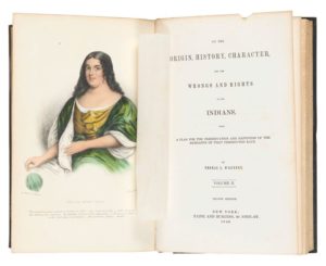M’KENNEY (Thomas Loraine). • Memoirs, Official and Personal : with Sketches of Travels among the northern and southern Indians : embracing a War Excursion, and Descriptions of Scenes along the Western Borders. •• On the Origin, History, Character, and the Wrongs and Rights of the Indians, with a Plan for the Preservation and Happiness of the Remnants of that persecuted Race. New York, Paine and Burgess, 1846. 2 tomes en un volume in-8° bradel, percaline noire, dos orné (cartonnage de l’époque). « Second edition. » • Un portrait de l’auteur en frontispice, une lettre en fac-similé, et six planches lithographiées. •• Un portrait de « Po-Ca-Hon-Tas » en couleurs en frontispice et cinq planches lithographiées. Deux timbres humides sur le premier titre : rousseurs.