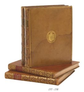 PARRY (William Edward). • Journal of a Third Voyage for the Discovery of a North-West Passage from the Atlantic to the Pacific : performed in the Years 1824-25, in His Majesty’s Ships Hecla and Fury […]. •• Narrative of an Attempt to reach the North Pole, in Boats fitted for the Purpose, and attached to His Majesty’s Ship Hecla, in the Year mdcccxxvii. […]. London, John Murray, 1826 & 1828. 2 volumes in-4°, veau blond, filet doré encadrant les plats, dos à nerfs orné (reliure anglaise de l’époque). • XXVIII + 186 + [II] + 151 (« Appendix ») pp. ÉDITIONS ORIGINALES des TROISIÈME et QUATRIÈME VOYAGES • « Appendix » avec pagination séparée, relié in fine. Onze planches gravées dont deux repliées in fine. •• Six planches gravées et une grande carte repliée in fine. Des bibliothèques Elizabeth K. Staudt et Sr. John Mordant, Bart. Walton Warwickshire, avec ex-libris. Épidermures sur les plats : quelques taches sur le dos : quelques décharges : légères mouillures. Sabin, 58867 & 58868.