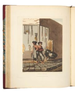 VIDAL (Emeric Essex). Picturesque Illustrations of Buenos Ayres and Monte Video, consisting of twenty-four Views : accompanied with Descriptions of the Scenery, and of the Costumes, Manners, &c. of the Inhabitants of those Cities and their Environs. London, R. Ackermann & L. Harrison, 1820. In-folio, demi-maroquin rouge à grain long et à coins, filet doré bordant les plats, dos à nerfs orné (reliure de l’époque). ÉDITION ORIGINALE. 24 aquatintes coloriées à la main dont quatre repliées, gravées par SUTHERLAND, MAILE, BLUCK, & HAVELL, d’après Emeric Essex VIDAL. UN DES 50 EXEMPLAIRES SUR GRAND PAPIER. De la bibliothèque Daniel Jones Long, avec ex-libris. Dos passé : accident en coiffe de tête : rares rousseurs. Abbey, Travel, 698 : Colas 3000 : Hiler, 878 : Prideaux, 355 & 375 : Sabin 99460 : Tooley 495.