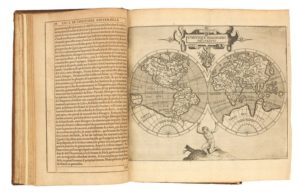 • WYTFLIET (Cornelius). Histoire vniverselle des Indes occidentales […] où il est traicté de leur descouuerte, description, & conqueste faicte tant par les Castillans que Portugais, ensemble de leurs moeurs, religion, gouuernemens, & loix. •• MAGIN (Antoine). Histoire vniverselle des Indes orientales […] contenant la descouuerte, nauigation, situation & conqueste, faicte tant par les Portugais que par les Castilans. Ensemble leurs moeurs, ceremonies, loix, gouuernemens, & reduction à la foy catholique. ••• La Suite de l’Histoire des Indes orientales, de la conversion des Indiens. A Douay, Chez Franç[ch]ois Fabri, 1607. 3 ouvrages en un volume in-4°, veau, double filet doré encadrant les plats, dos à nerfs orné (reliure de l’époque). • 76 ff. signés : à2, ** 2 & A-S4, •• 50 ff. signés : [*]2, ***2, * 2, a-e4, ee4, f6, g-h4 & i6, et ••• 43 ff. signés : [*] & A-I4 & K6 (avec nombreuses erreurs de pagination). Deuxième édition en Français après celle de 1605. Trois titres ornés d’un décor architectural et dix-neuf cartes repliées identiques à la première édition latine de 1597 : lettrines. Des bibliothèques • Jean Baptiste Denis Guyon de Sardière, avec ex-libris manuscrits sur le titre et dernier feuillet • Huzard avec « griffe » au verso du premier titre & • C. Cruz Montt, avec ex-libris. Le titre « Livre second […] » devant s’intercaler entre K2 et K3 (ce que confirme sa réclame « Les deux ») est resté en S4 dans notre exemplaire, à l’endroit ou il avait été imprimé. Les cahiers de table de la seconde partie (* 2 & *** 2) sont placés en début de partie et inversés. Quelques annotations manuscrites marginales : un mors fendillé : restaurations aux coins et coiffes : épidermures : quelques cahiers brunis. UN DES PREMIERS ATLAS SUR LES AMÉRIQUES avec les CARTES et la MAPPEMONDE adaptées de celles de MERCATOR, ORTELIUS, PLANCIUS ET WHITE. Alden & Landis 607/100 : Borba de Moraes II, 381 : JCB (1919) II, 48 : Phillips Atlases 1143 : Sabin 105700.