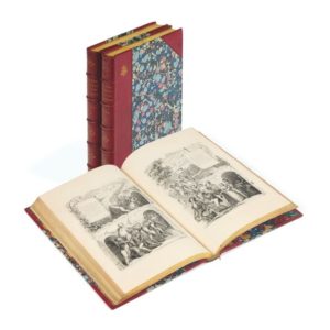 Chants et Chansons populaires de la France. Première, Deuxième et Troisième série. Paris, Delloye, 1843 / 1844. 3 volumes in-4°, demi-maroquin rouge, tranches dorées, sans pagination. Très bel exemplaire de ce grand classique, complet des trois volumes requis, textes et musiques des chansons célèbres accompagnés de fines gravures sur acier. La reliure signée Allô est très fine et presque inattendue pour ce genre de publication « populaire ». Grand Ex-libris musical gravé « Aug. Vincent / Parisis » en première garde de chacun de ses beaux volumes, ensemble en très bel état.