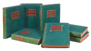 [COMPOSITEURS ITALIENS du XVIIIe siècle]. Journal d’Ariettes italiennes des plus célèbres Compositeurs […] / Recueils d’airs italiens. Paris, Bailleux, Imbault (1779-1783), 1784-1787, 7 forts volumes in-folio, demi-vélin vert, étiquettes de maroquin rouge au dos et au premier plat (reliure de l’époque). (Collation précise sur demande). Exceptionnel ensemble complet des volumes de chants et des parties séparées, un grand travail d’éditeur mené par Bailleux, successeur de Madame Boivin à l’enseigne de la Règle d’or entre 1764 et 1798. Très belle gravure, sur papier fort (bleuté parfois) des mélodies de ces fameux italiens : Anfossi, Astarita, Baini, Blanchi, Borghi, Borroni, Caruso, Cimarosa, Colla, Giordanello, Guglielmi, Mengozzi, Mortellari, Monza, Paisiello, Rauzzini, Rust, Sacchini, Sarti, Zingarelli… et on en oublie. Deux volumes constituent les « Parties de Chants » années « 1784, 1785 et 1786 » puis « 1787 etc », (452 et 396 pp. respectivement, belle étiquette gravée « Bertault, Md Papetier » contrecollée en première garde du premier volume). La mention « Etc » de la seconde reliure correspond à la présence d’ariettes de la première période d’édition chez Bailleux (1779/1783) et surtout des rares « Recueils d’airs italiens » publiés par Imbault, dont l’intégralité des 12 premières livraisons sont données en fin de volume : elles présentent la particularité d’être « en partitions », intégrant le quatuor à cordes (les deux dernières livraisons sont doublées par une version avec chant et basse seule), oeuvres de Cimarosa, Guglielmi, Jomelli, Martini, Rispoli, Sacchini. Cinq autres volumes (de plus de 250 pages chacun), aussi essentiels que difficiles à réunir, rassemblent les parties séparées de Violon 1, Violon 2, Alto, Basse et Hautbois, qui correspondent parfaitement aux parties de chant, dans l’ordre des premières reliures.« Ces publications sont mal connues et présentent un intérêt évident, notamment pour la connaissance des programmes du Concert Spirituel et ceux du Concert des amateurs. Les références à la fameuse cantatrice Madame Todi permettent de reconstituer une partie de son répertoire. » (Collection du professeur de Musicologie Jean Mongrédien, Drouot, Piasa, 30 avril 1997). Bel état général.