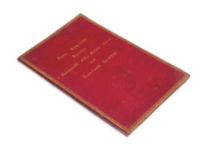 Gaspare Luigi Pacifico SPONTINI (1774-1851). Trois Romances avec accompagnement de Piano ou Harpe. Paris, chez Melles Erard [pl. 598, 1805 ou 1806]. Grand in-folio, maroquin rouge à grain long, plats à recouvrement, décorés en marge de frises dorées, gardes de soie verte. Titre et 7 pp. Superbe exemplaire de présent, qui selon la page de titre, répétée en lettres dorées au premier plat, consiste en «Trois Romances dédiées à Mademoiselle Zillia Mariette Auriol par Gaspard Spontini ». Selon les registres de Montauban, David Joseph Mariette Auriol, minotier, a épousé Anne Senilh en 1788. Zillia (1789) et Pierre Daniel Mariette (1790) sont leurs enfants. En ce qui concerne Spontini, il semble que son activité est sans cesse dès son arrivée à Paris: en 1804, il s’intéresse au « style français » et place plusieurs opéras-comiques au Théâtre Feydeau, sans négliger la fréquentation des meilleurs salons: il y croise Madame de Staël et particulièrement Joséphine de Beauharnais, qui le nomme «Compositeur de la chambre de Sa Majesté L’Impératrice » en 1805. L’année suivante, après la composition de ces «Trois Romances », il ne manque pas de fournir une brillante Cantate dédiée à l’Empereur Napoléon Ier. Très élégante reliure de l’époque, petites taches sans gravité au premier plat