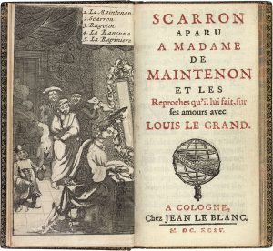 Pamphlet fort rare, qui fut détruit avec le plus grand soin. En novembre 1694, un ouvrier imprimeur et un garçon relieur furent pendus en place de Grève pour avoir participé à sa diffusion. Gay n’en connaissait qu’une édition, sans nom d’imprimeur et précédée d’un frontispice différent. Celui de cet exemplaire met en scène cinq personnages : La Maintenon, Scarron, Ragotin, la Rancune, la Rapinière. Charmant exemplaire relié avec goût par David. De la bibliothèque Wolfgang Metzner, avec ex-libris et initiales sur une garde. Très légers frottements aux coins, coiffes et coupes. Gay, III, 1079. On y joint : [BOSSELMAN DE BELLEMONT]. Maintenoniana, ou Choix d’anecdotes intéressantes, de portraits, de pensées ingénieuses… tirés des Lettres de Madame de Maintenon. Amsterdam, s.n., 1773. In-8, basane racinée, dos lisse orné (Reliure début du XIXe siècle). Épidermures au plat supérieur, gardes et des feuillets brunis.